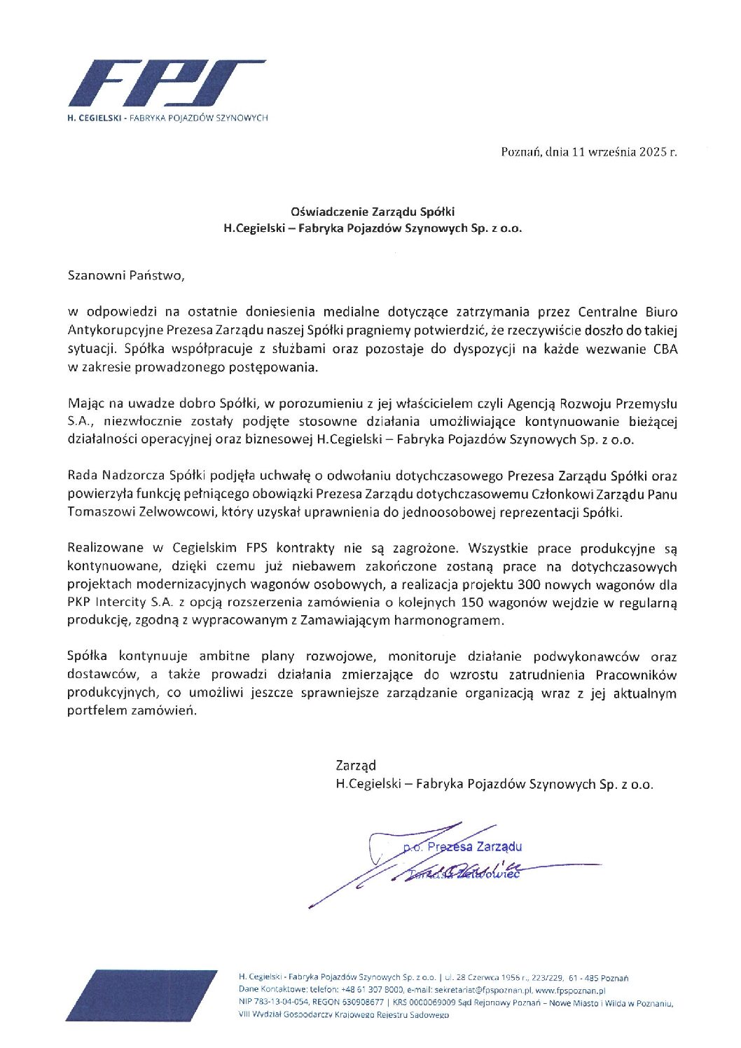 Mając na uwadze dobro Spółki, w porozumieniu z jej właścicielem czyli Agencją Rozwoju Przemysłu S.A., niezwłocznie zostały podjęte stosowne działania umożliwiające kontynuowanie bieżącej działalności operacyjnej oraz biznesowej H.Cegielski – Fabryka Pojazdów Szynowych Sp. z o.o.
